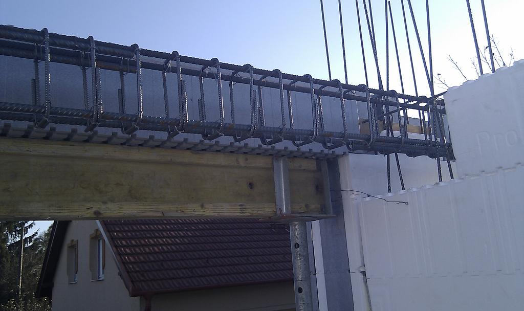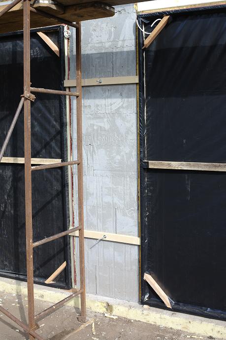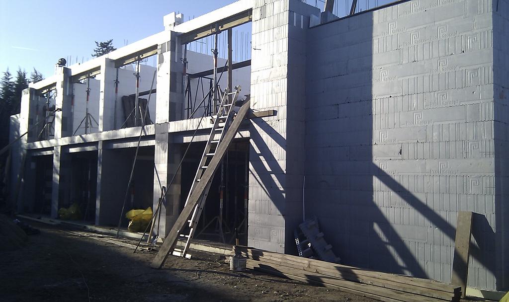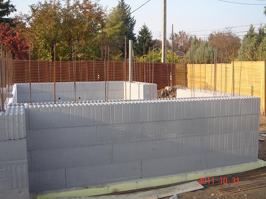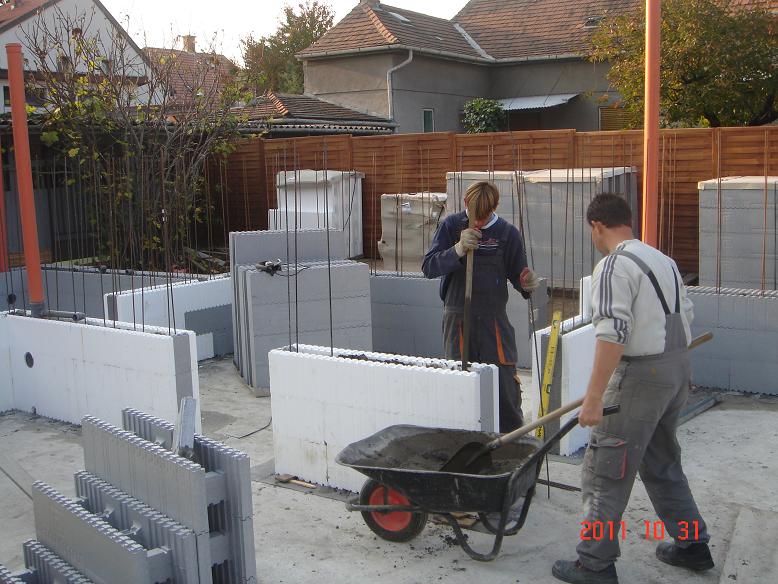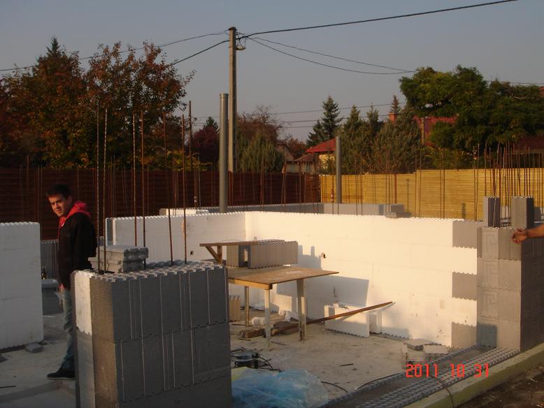 A homlokzati falak 5/15/20-as Neopor zsaluból készültek. A képeken látható az igen nagy déli tájolású ablakoknak kihagyott hely, illetve, hogy a belső teherhordó falak 5/15/5-ös Neopor zsaluból készülnek, amivel a hangszigetelés is megoldott. Gyorsan lehet haladni az építkezéssel, ha ugyanolyan szerkezetűek a külső és belső falak.