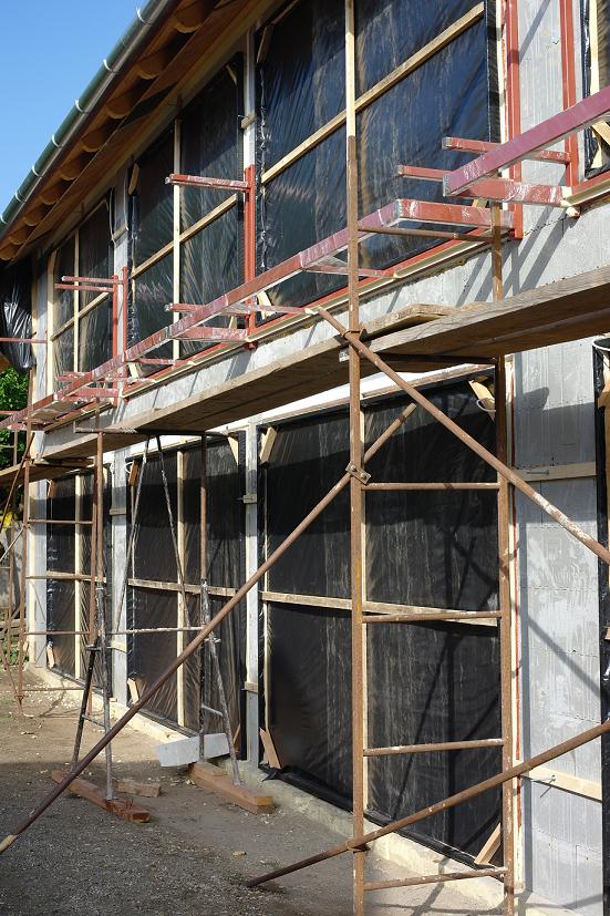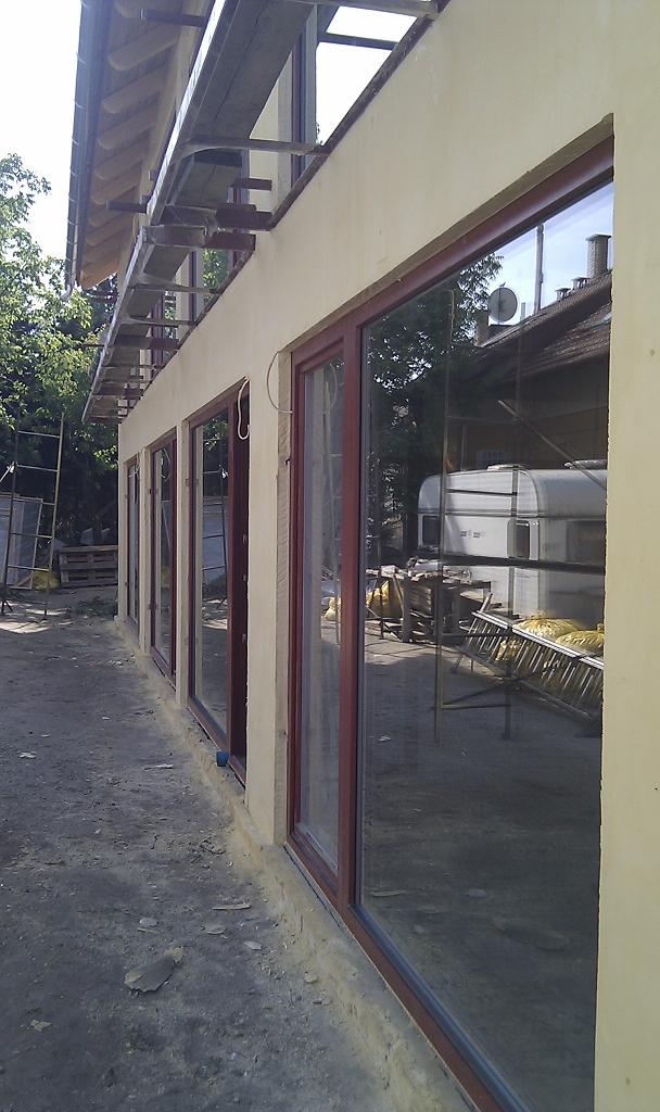 Beépítés során először felragasztottuk a keretre a szalagot (Förch), majd a két oldalon 3-3, alul és felül az ablakok osztásánál 1-1 laposvasat rögzítettünk a keretre. Beillesztettük a keretet, függőbe állítottuk, és a vasakat a beton rétegbe rögzítettük. 1 nap múlva körbefújtuk purhabbal. Összesen 1 cm szigetelés maradt kívül az ablakok külső síkja előtt. A teljes déli felületre (ahol ezek a nagy ablakok vannak) kősőbb fújunk 5 cm
