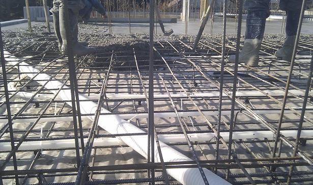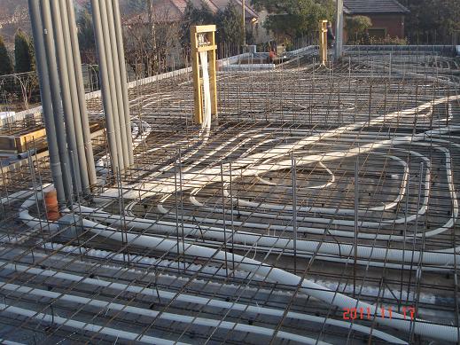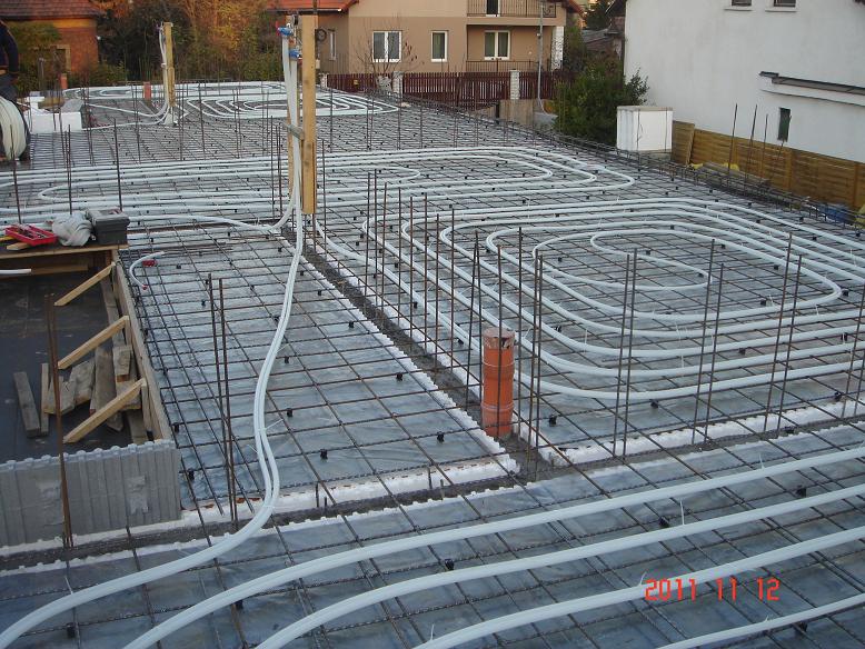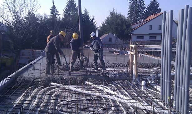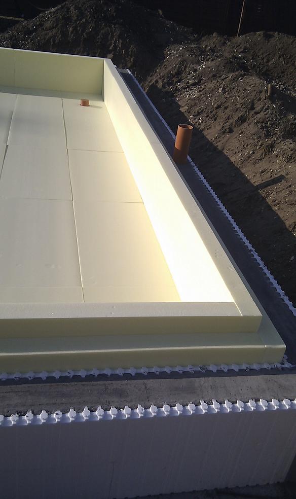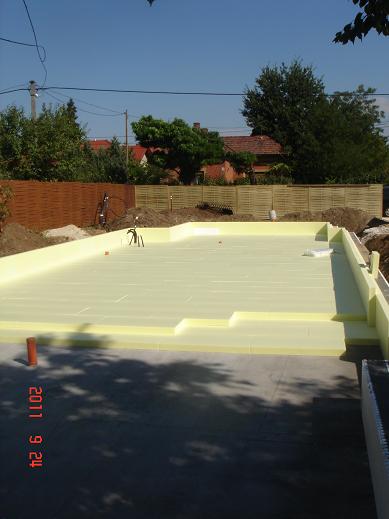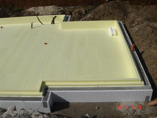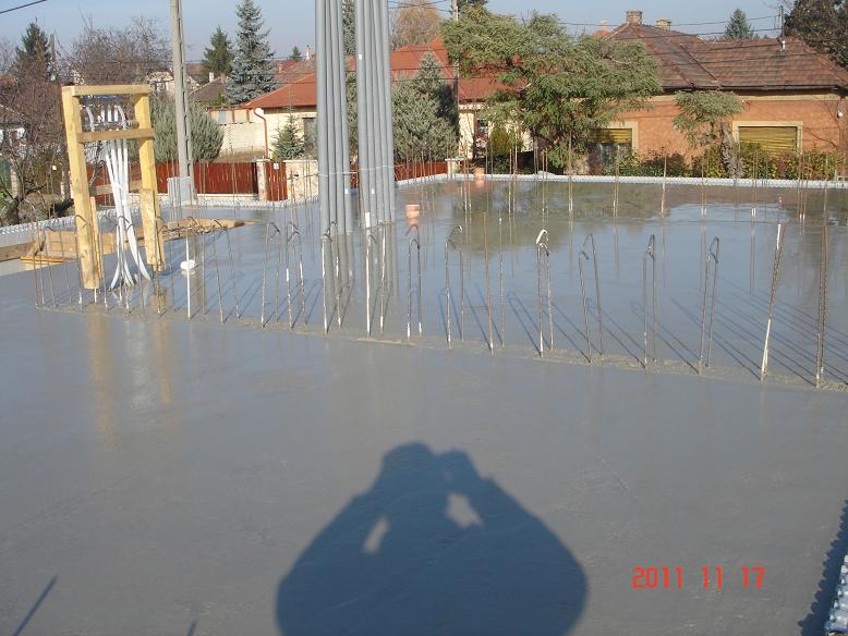 A 25 cm-es vasbeton lemezalapra még nem került rá a 18 cm EPS, a szerelőbeton és a burkolat. Ha ezek is rákerülnek, akkor kapjuk meg a nullszintet. A lábazat melletti 10 cm-es XPS még látható, később már a föld alatt lesz.